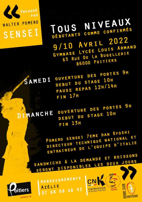 L’équipe du Kendo club Poitiers organise un stage avec Walter Pomero, actuel DTN de l’Italie, le 9 et 10 avril
